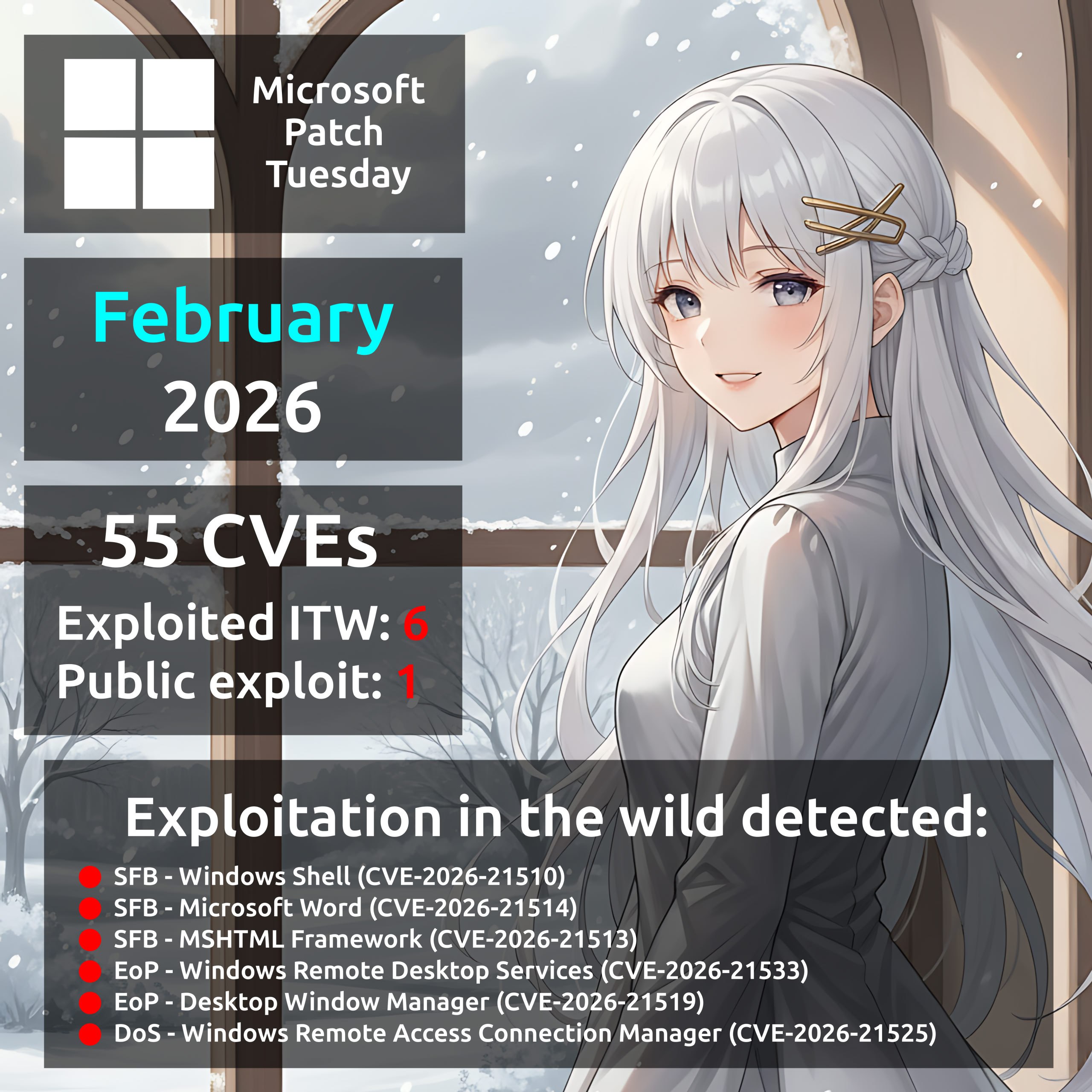 January Microsoft Patch Tuesday. A total of 114 vulnerabilities, twice as many as in December. There is one vulnerability with evidence of in-the-wild exploitation: